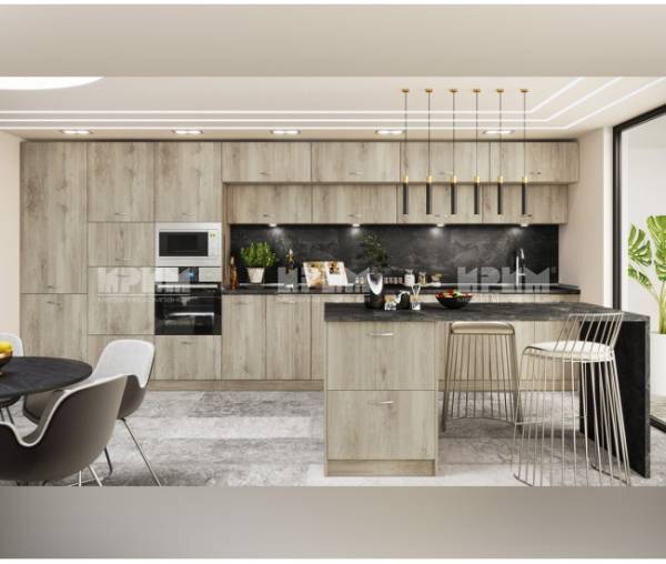 “Ready kitchen with City Island 974”- proposal with whole thermoplars. Includes a kitchen island and a meal countertop. Cabinets have mechanisms for smooth door closure.