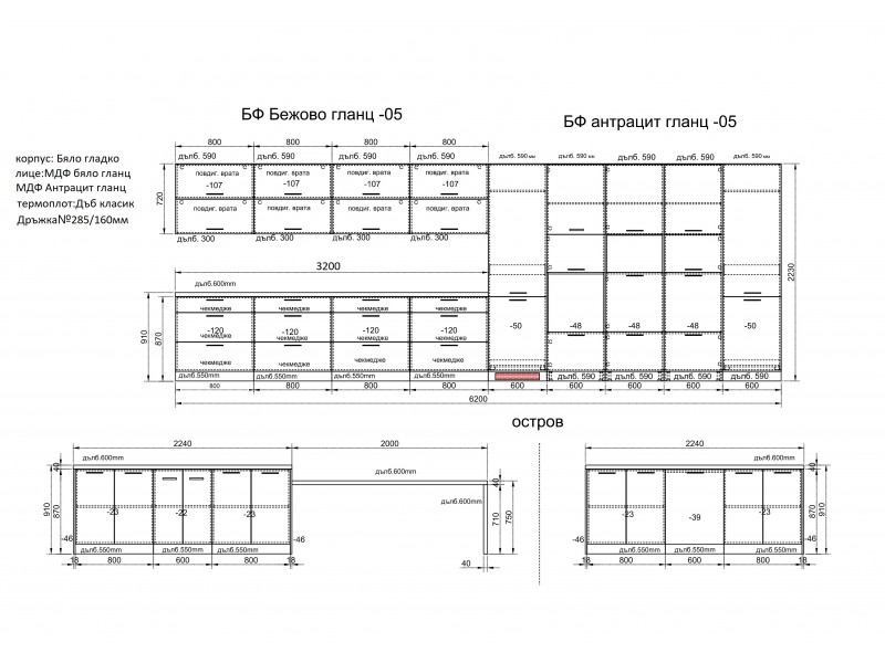 Цветова комбинация: бяло гладко, МДФ бяло гланц, МДФ антрацит гланц.