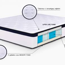 Индивидуалността и лично предпочитание се подсилват от технологично добавените LATEX LIKE And MEMORY FOAM в контактната зона. Създадената асиметрична уникалност предразполага към търсене и намиране на перфектната среда за сън.
