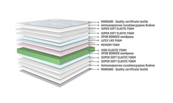 Към добре познатата превърнала се в почти kласическа за ценителите на качествения сън сърцевина от HIGH ELASTIC And MEMORY FOAM, ние продуктовите инженери от НАНИ добавяме и разработка, позната ни от SUPER HIGH CLASS модели матраци – LATEX LIKE FOAM!
