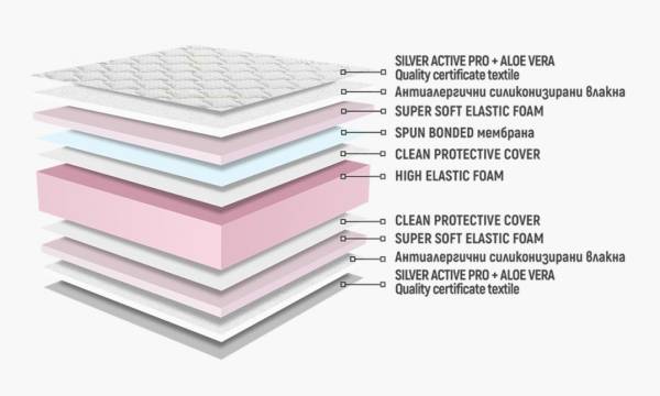 HIGH ELASTIC FOAM предлага необходимата балансирана ортопедичност. За липсата на точки със свръх напрежение, в контактната с тялото зона е добавен SUPER SOFT ELASTIC FOAM. Структурата на сърцевината от „отворени“ клетки и 3D дишаща лента създава оптимална система за максимална проветривост и вентилация на влагата и в дълбочина.
