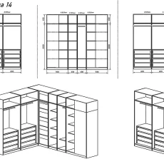 Гардеробна Dress 14 е модулна система, която се състои от осем гардероба с надстройки, разполагащи с лостове за закачалки, рафтове и чекмеджета с механизъм за плавно затваряне. Системата ви предоставя достатъчно място за съхранение на дрехи и вещи.