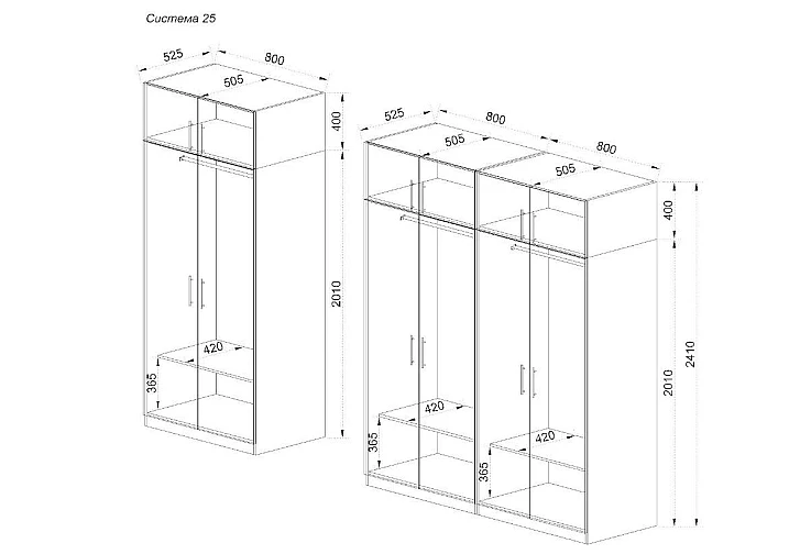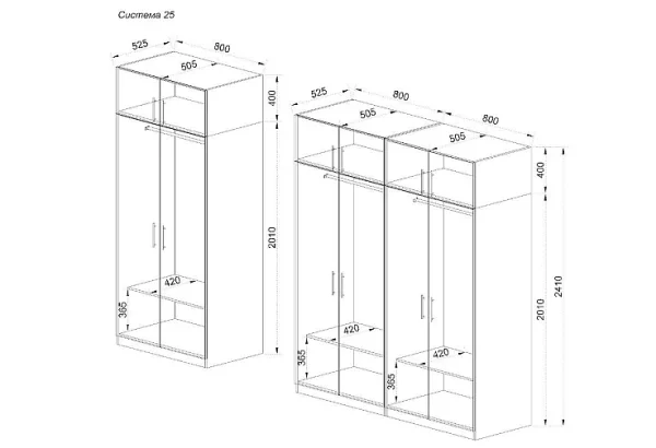 Гардероб Dress 25 е стилна модулна конфигурация за гардеробно помещение. Моделът включва гардероби с надстройки, които Ви предоставят достатъчно място за съхранение на Вашите дрехи и аксесоари.