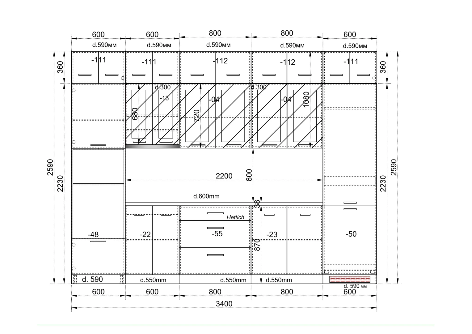 Долен ред – 3400 / 600 / 2230 – дълбочина на шкафовете под плот 550мм