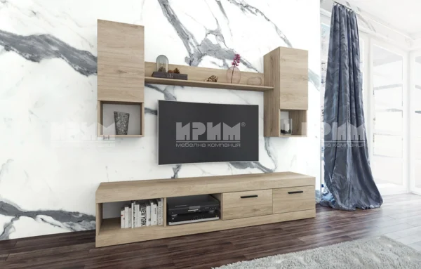 Секция Сити 6021 e изключително хубава в това, че е семпла, но в същото време и разчупена. Секционният комплект се състои от ТВ шкаф и два шкафа, свързани с полица за окачване на стена.