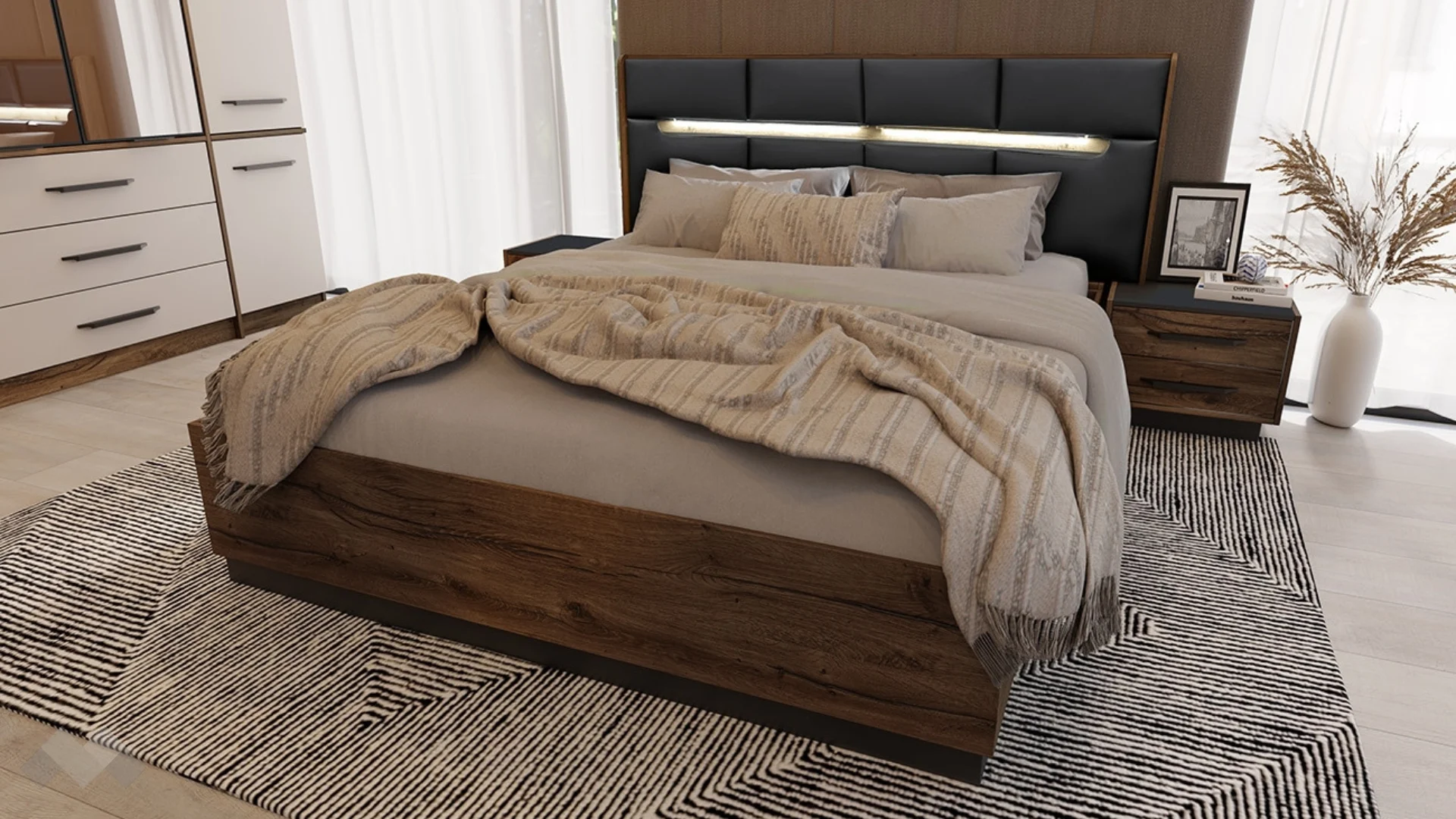 Спален комплект Норел е нов и свеж модел благодарение на преобладаващата топлина създадена от декор сатен. В съчетание с тъмно дървесно, черна кожа и лед осветление на таблата, този комплект се откроява със своя различен стил. Всички врати и чекмеджета са снабдени с плавно затваряне. Има възможност да се допълни с удобна и функционална тоалетка. Спалнята е предвидена за матрак с размер 1600 / 2000mm. There is an opportunity to use, as with single -legged, and with a two -faced mattress by means of a lamella frame.