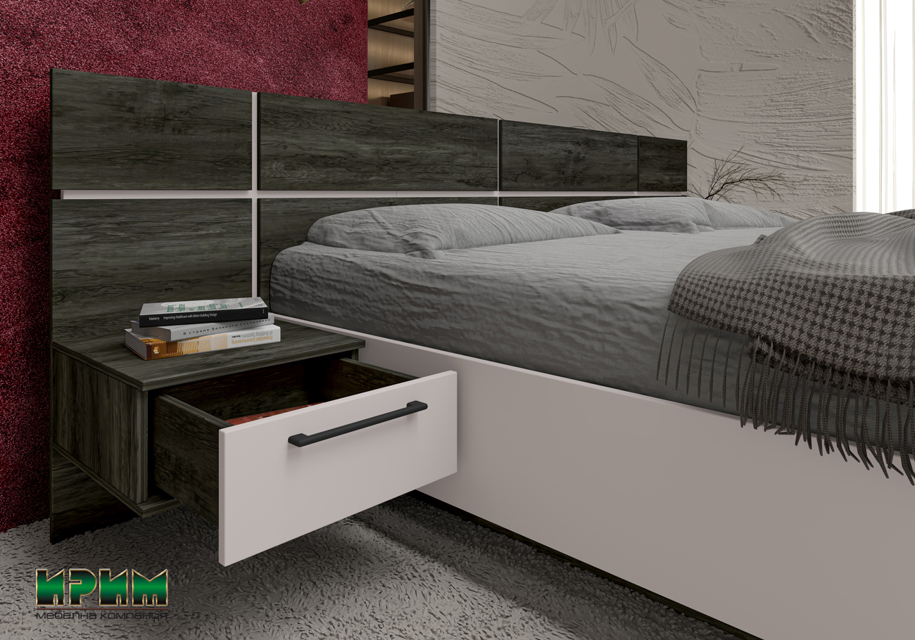 Дъб герано е нов декор, който представлява много тъмно състарено дърво – насока от актуалните тенденции. В този комплект имаме алуглас врати със сиво закалено стъкло на гардероба и скрина, които допринасят за различната му визия. Всички врати и чекмеджета са снабдени с плавно затваряне. Повдигащият механизъм е включен към спалнята. Серията се предлага по отделни модули за да се напасне по нуждите на клиента Спалнята е предвидена за матрак с размер 1600 / 2000mm. There is an opportunity to use, as with single -legged, and with a two -faced mattress by means of a lamella frame.